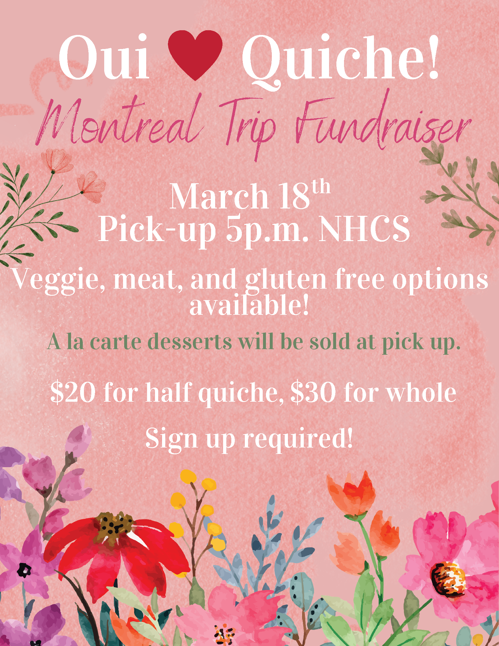 Wednesday, March 18, 2026 HOT LUNCH: Pepperoni and Cheese Pizza Gr. 10: PSATS @ School Gr. 11 SATS @ School 2:00-3:30P: Gr. 3-8 Acting Out @ WCC 4:00P: Middle School eSports 5:00P: Oui Love Quiche Montreal Fundraiser @ Pick Up at School _________________________ MEAN GIRLS 4:00–5:30 PM Small Group Music Rehearsal Called: Plastics (Astrid, Allie, Addison), Lily Martin, Maddie, Jared @ NHCS |