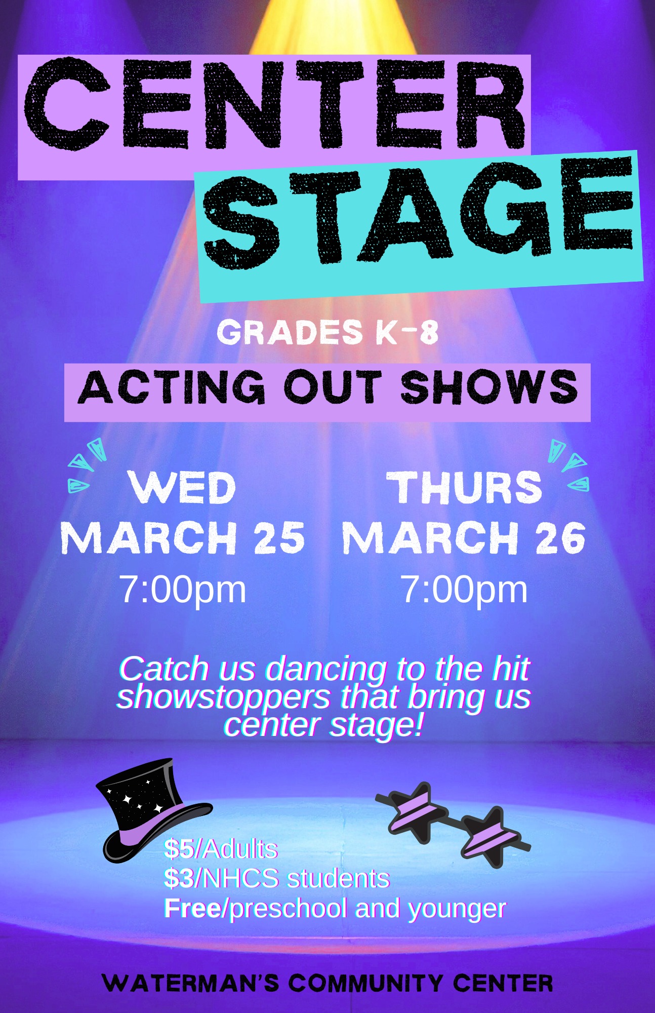 2:00-3:30P: Gr. K-8 Acting Out @ WCC 3:45P: Students and Staff leave on last ferry for BE BOLD Conference 4:00P: Middle School Esports 4:00-5:00P: Mean Girls Rehearsal Small Group Music (Check TeamReach if you are called) 6:15P: Students and Staff return from BE BOLD Conference 7:00P: Center Stage Show @ WCC Gr. K-8 |