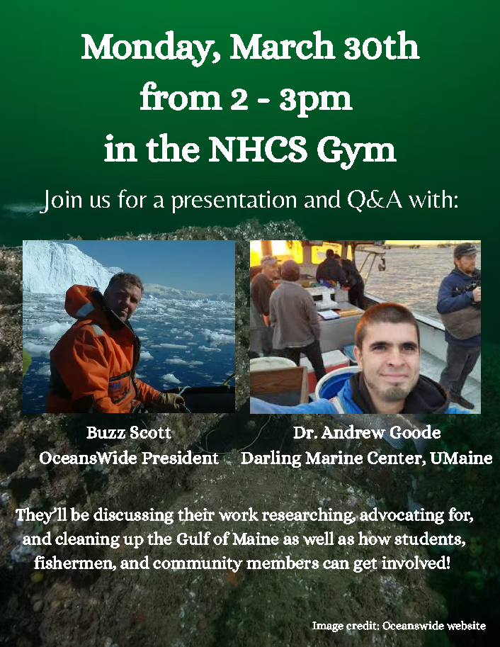2:00-3:00P: Gulf of Maine Scientists and Advocates Buzz Scott and Andrew Goode Presentation in Gym